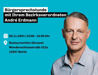 Haben Sie Fragen, Anregungen oder möchten einfach Ihre Anliegen mit uns teilen? Unser Bezirksverordneter André Erdmann steht Ihnen in seiner Bürgersprechstunde persönlich zur Verfügung. Nutzen Sie die Gelegenheit, um direkt mit uns ins Gespräch zu kommen! Wir freuen uns auf den Austausch.